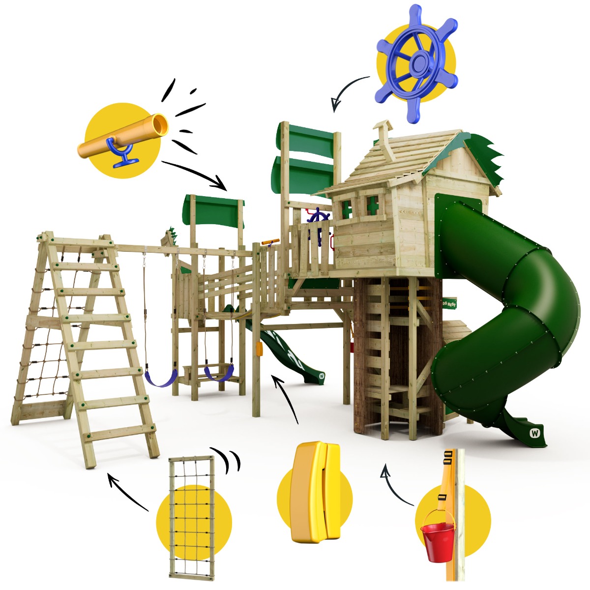 No barco à vela NEVERLAND Gold, as crianças podem realizar os seus sonhos. A NEVERLAND Gold Edition é uma ampliação da casa na árvore Wickey NEVERLAND e oferece brincadeiras ainda mais variadas e maiores. Ice as duas velas gigantes e parta com o gigantesco barco de aventura para águas desconhecidas. Com este barco, as crianças dominam vento e tempo e navegam sobre as ondas como se voassem. Podem baloiçar bem alto e observar tubarões e outros animais marinhos. Se o mar ficar agitado podem esconder-se com os amigos na casa na árvore, pois a NEVERLAND Gold tem espaço suficiente para todos. E ficam protegidos dos piratas e dos ladrões. As crianças podem dar largas à imaginação e do barco podem criar uma ilha deserta, uma casa na árvore numa floresta encantada ou uma selva com uma ponte suspensa oscilante.